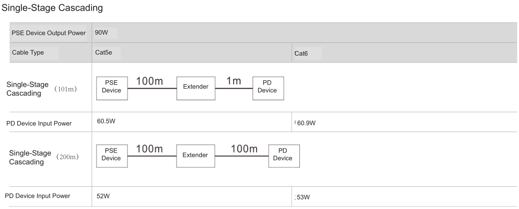 Transmission Distance | Each extender extends by 100m, max 3 grade Cascade, total 400m. |
